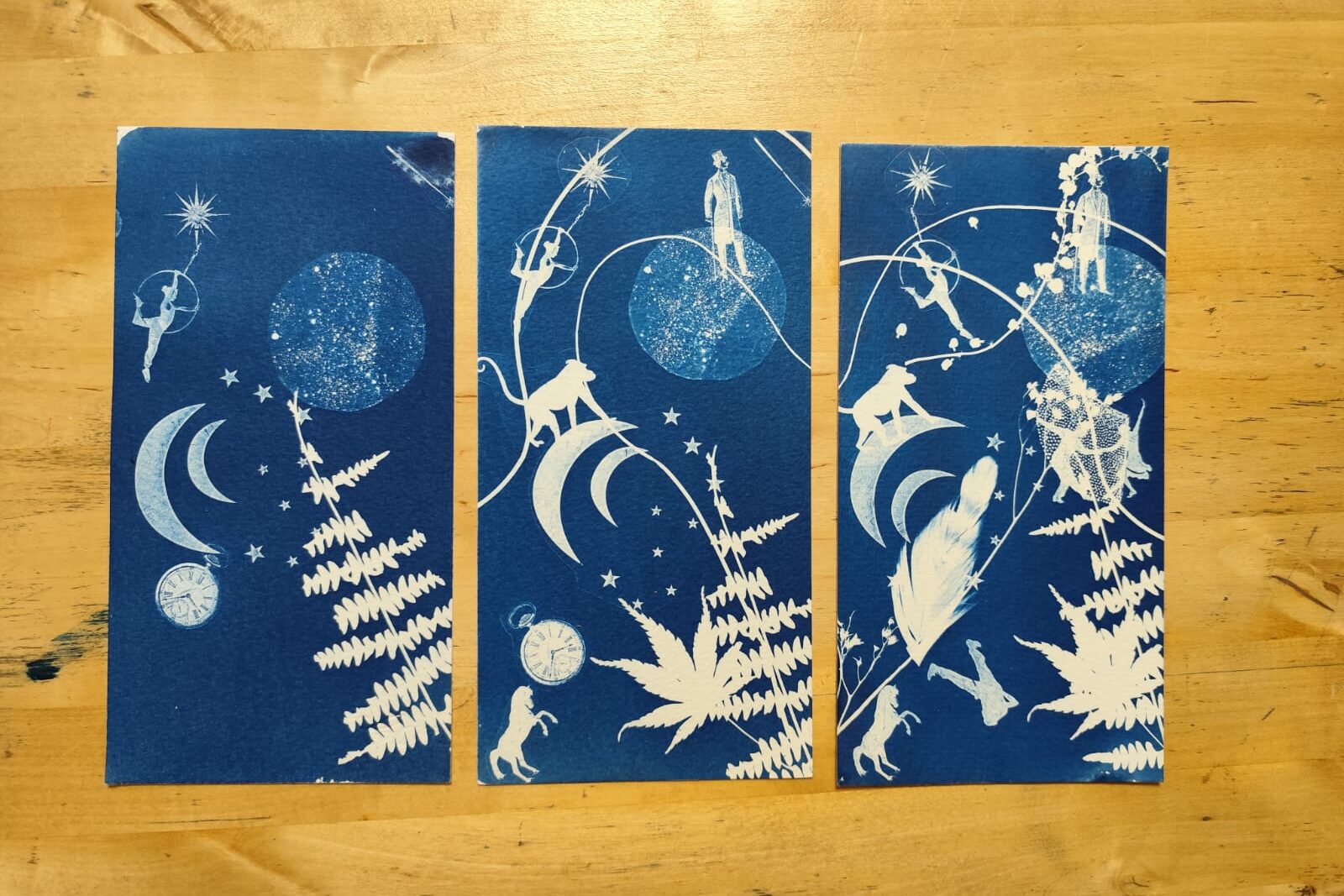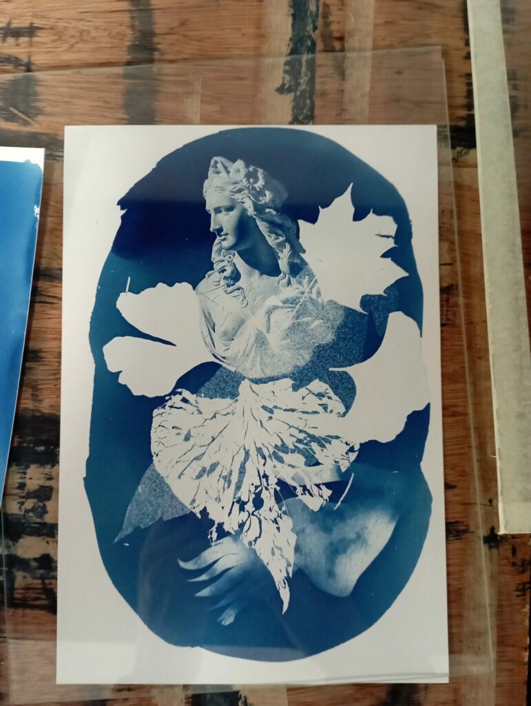 J’anime des ateliers cyanotype depuis 2022. Je suis intervenue dans différentes structures et j’ai formé, le nombre commence à être vertigineux, bien 300 personnes, que ce soit sur un temps court ou sur plusieurs mois. Cette technique est ultra créative et permet à tous de s’exprimer, avec des images monochromes d’un bleu sensible. Je suis intervenue aussi bien en milieu scolaire, qu’en centres sociaux, dans des musées, auprès de très jeunes, de personnes en situation de handicap, des adultes de tout horizons et de tout âge. Ces rencontres sont toujours inspirantes pour moi aussi, c’est à chaque fois, la découverte d’un imaginaire différent du mien et unique.