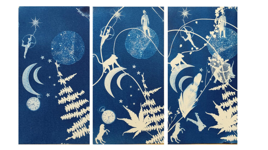 Le cyanotype a été une révélation pour moi, car j’ai pu retrouver le plaisir du tirage photographique que j’avais pratiqué en argentique noir et blanc. Le négatif s’imprime sur un support transparent, à partir de photos numériques.